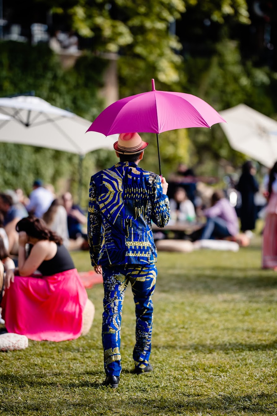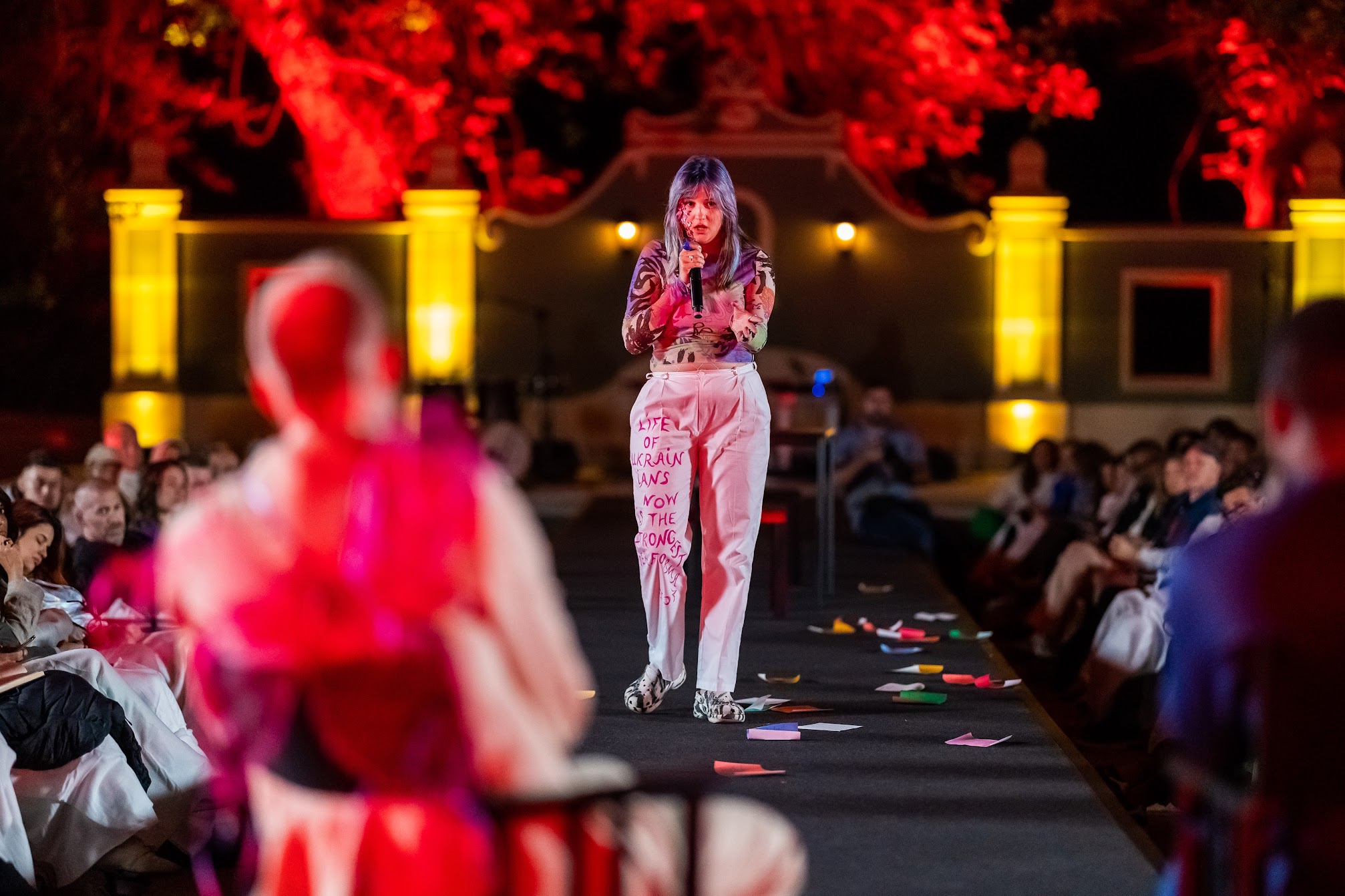Performers wore an evolving wardrobe of coordinated yet individualized costumes inspired by traditional designs, and could present as themselves and/or specific characters taken from Ukrainian history or folklore. Performances offered opportunities for conversation as well as wordless individual encounters from poolside or on the manicured lawns and garden patios, spontaneous interventions in and collaborations with the conference’s program, and orphic, haunting voices raised in traditional song, among other manifestations of a co-inhabited waking dream.